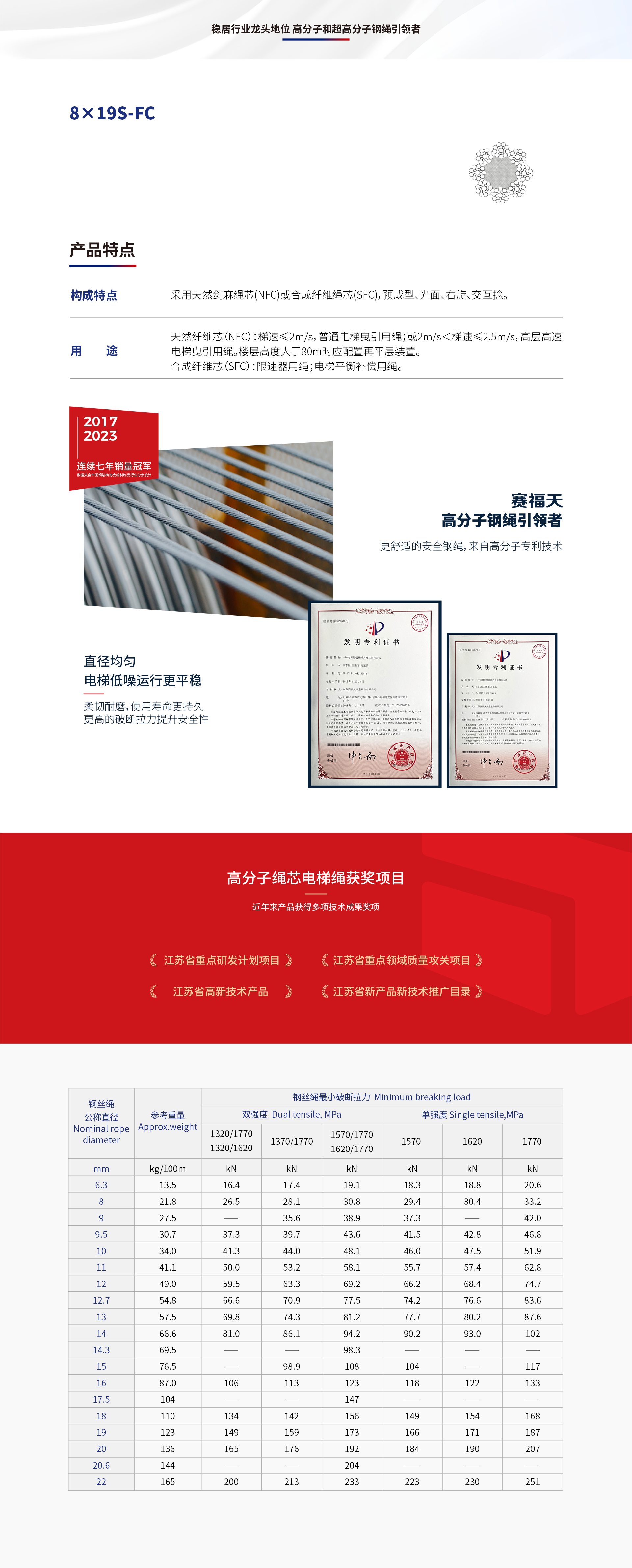 | 钢丝绳 公称直径 Nominal rope diameter | 参考重量 Approx.weight | 钢丝绳最小破断拉力 Minimum breaking load | ||||||
